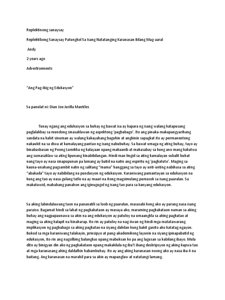 Example o Halimbawa Ng Maikling Replektibong Sanaysay tungkol sa Edukasyon. Sanaysay Pormal Martes Hulyo 26 2016. Archive sa Blog 2016 1 Hulyo 1 Inang Kalikasan Tula.
