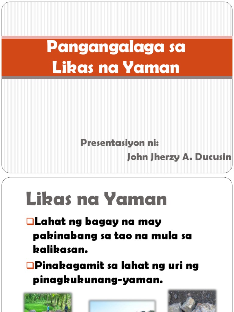 Paano nga ba natin maipapakita ang pangangalaga sa kapaligiran. Download as PPTX PDF TXT or read online from Scribd. Ducusin Likas na Yaman Lahat ng bagay na may pakinabang sa tao na mula sa kalikasan.